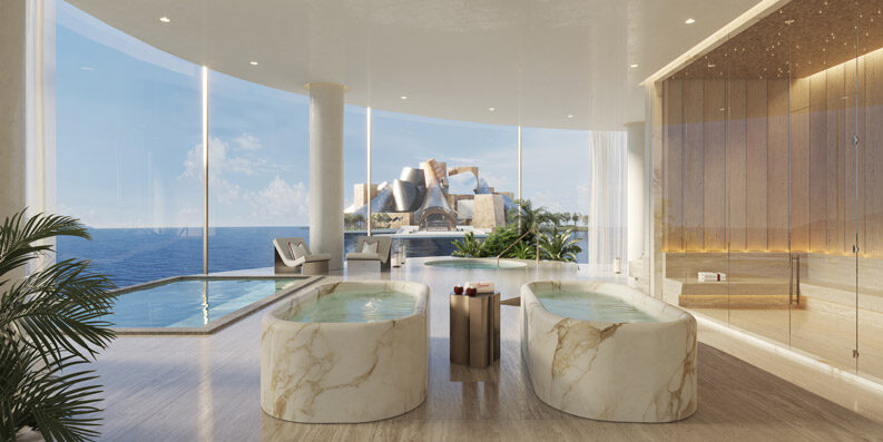 Las Baccarat Residences son también, en su nombre y en sus detalles, el resultado de una colaboración inusual. La maison francesa Baccarat —conocida por su cristal de lujo desde 1764— aportó su lenguaje visual al interior del proyecto, llevado adelante por el estudio StudioPCH.
