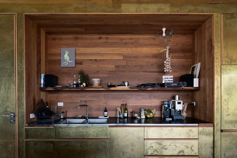 Esta textura integra la construcción en el sitio. Mientras las capas de color imitan las capas sedimentarias de la tierra aún expuesta del sitio de su época de mina de oro, antes de convertirse en el aserradero local.