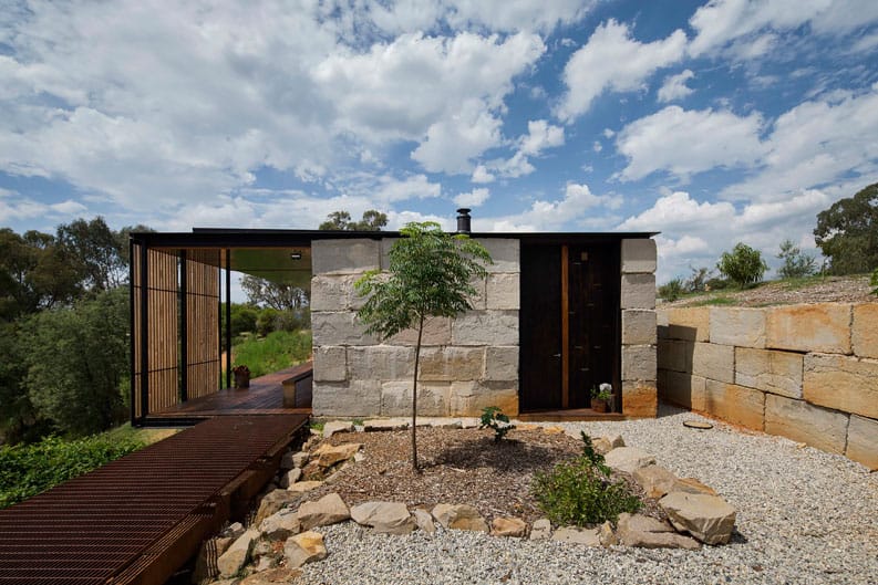 Casa Aserradero utiliza grandes bloques de una tonelada de hormigón recuperados, que la anclan en el paisaje, y una envolvente dinámica de construcción activa para regular el ambiente interior. La vivienda es una renovación hecha a mano de una morada bohemia y rústica preexistente, propia de un escultor de base regional.