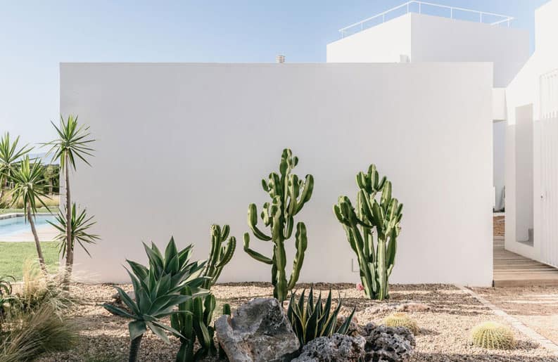 Una serie de volúmenes geométricos y vacíos esculpidos proporcionan patios privados a las habitaciones. Mientras que las ventanas, balcones y terrazas enmarcan estratégicamente el árido paisaje circundante y el océano Atlántico.