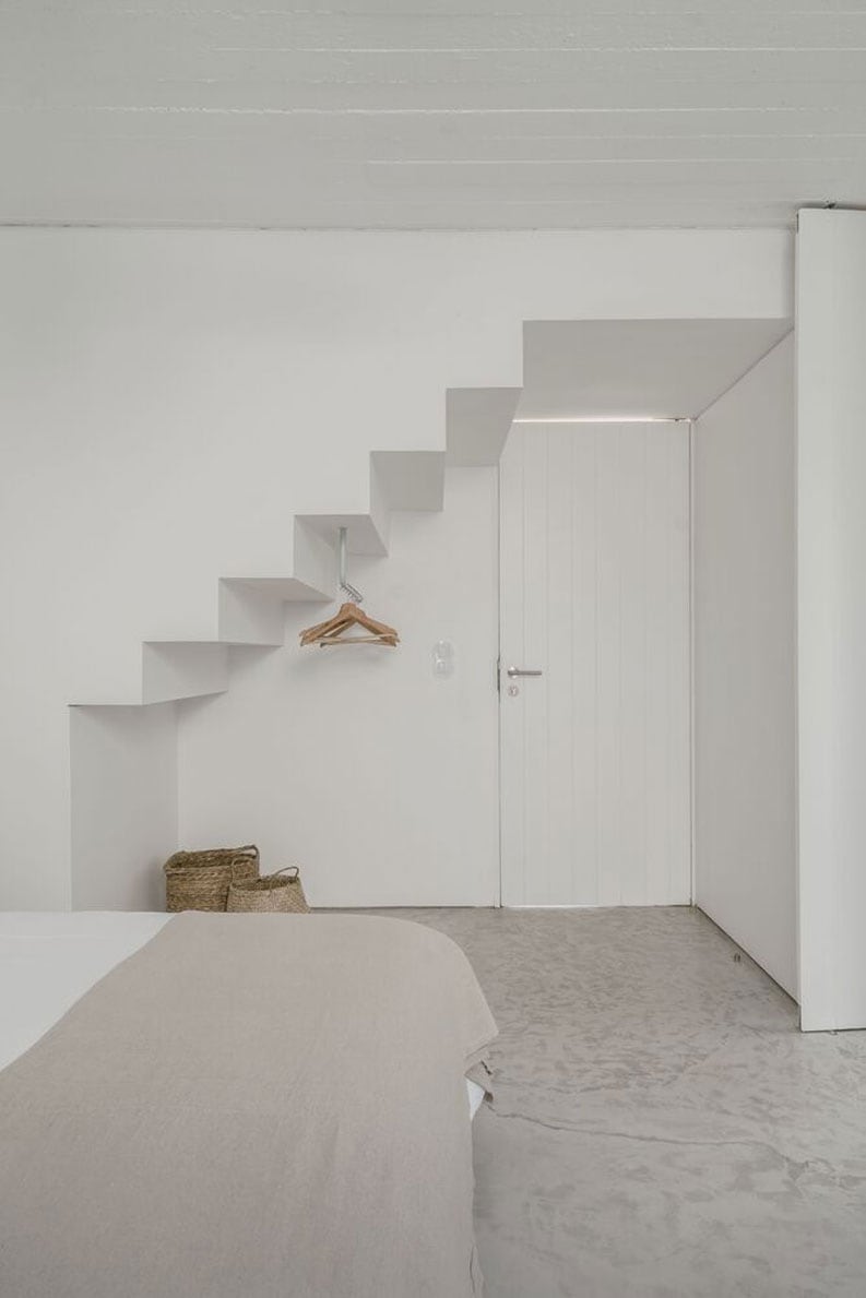 Las puertas de tablones de madera dispuestos verticalmente se han pintado de blanco, al igual que el techo de hormigón estructural realizado in situ. Los suelos de hormigón pulido contribuyen además a un interior minimalista.