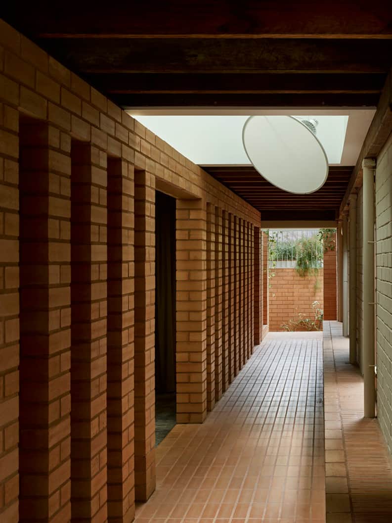 La amenaza de inundación hace que no se construyan muros sólidos en la planta baja para no obstruir el flujo del agua. Por lo que se decide extender el muro de ladrillos insertado a lo largo de la columna vertebral de la entrada, pero convertido en pilares de ladrillo.