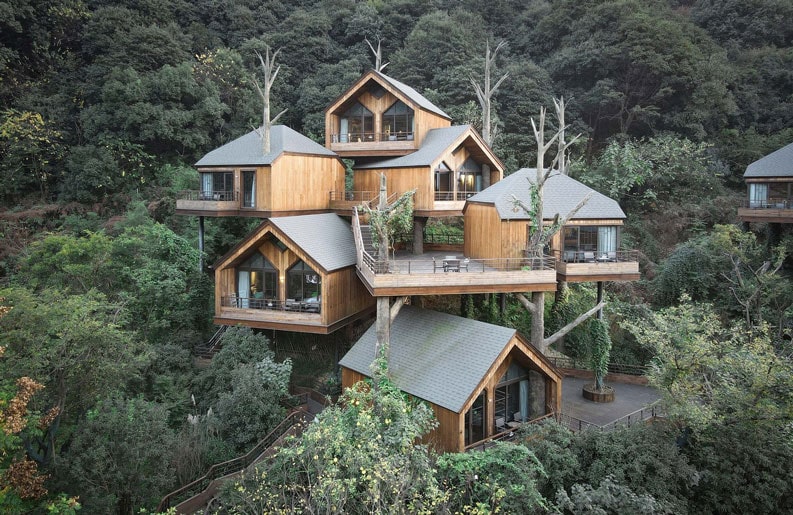 Situado en Xiaoshan Xianghu Resort, la «casa del árbol» pertenece al complejo hotelero Senbo Resort Hangzhou. La casa del árbol nace del deseo de volver a la «casa nido».