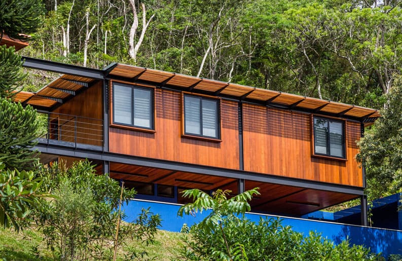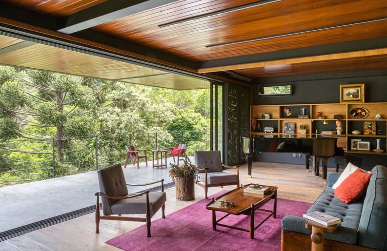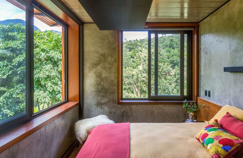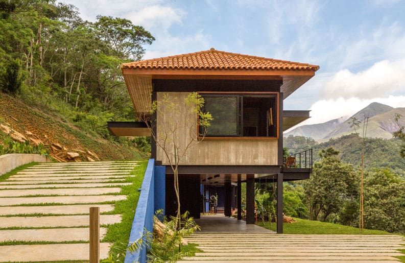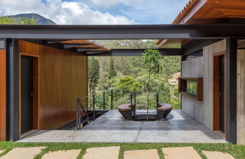 El entorno generoso en el paisaje favoreció la elección. El gran desafío, que se reveló en el camino, fue combinar la arquitectura contemporánea, de formas sencillas y rectas, objetivas en sus funciones, con el interior que recibiría muebles, objetos y obras de arte del modernismo brasileño. Acero, hormigón, madera y vidrio, materiales atemporales, aparecen a lo largo de los volúmenes y detalles de ejecución.