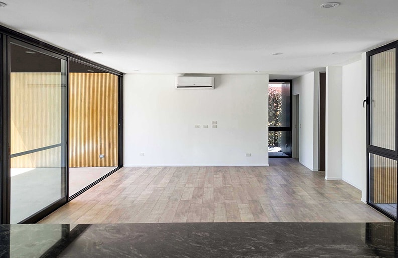 El segundo bloque (módulo 2 y 3) se propone como el espacio público dentro de la casa e integra al acceso, cuarto de estar, estudio y galería al contrafrente en un espacio continuo.