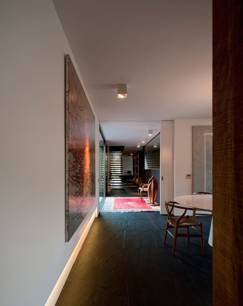 El espacio de circulación, entendida como un vacío, atraviesa la intervención y fase de distribución entre el acceso de la planta superior a través de una escalera flotante. En la planta inferior se encuentran los espacios de apoyo (baño de visita) y el área social: hall, escritorio/biblioteca, sala de estar, comedor y cocina.