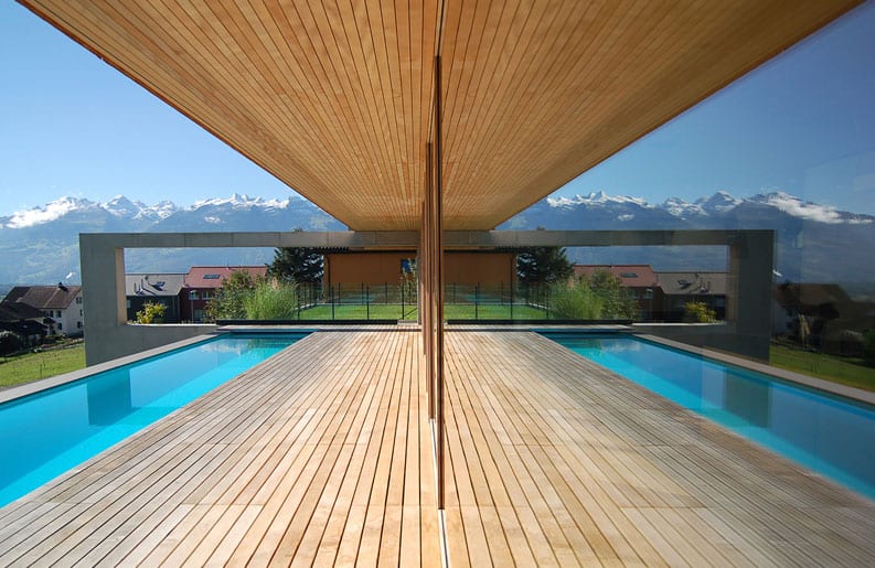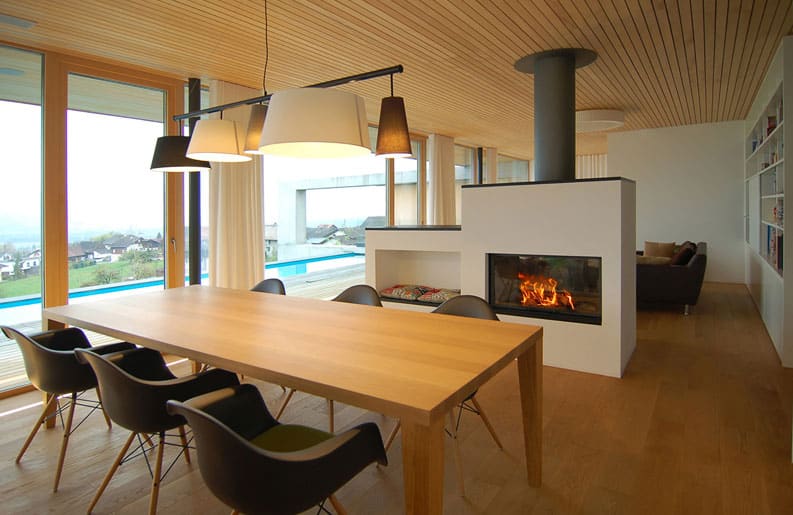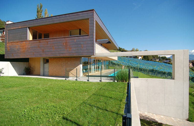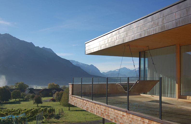 Casa en Liechtenstein se diseñó de acuerdo a las estrictas consideraciones de sostenibilidad. Involucrando la calidad ecológica de los materiales y las opciones tales como un sistema con agua caliente solar, calefacción geotérmica y una estufa en el living.