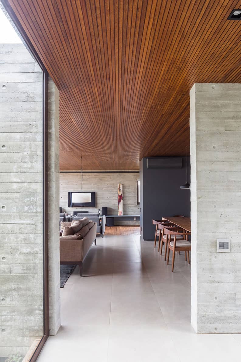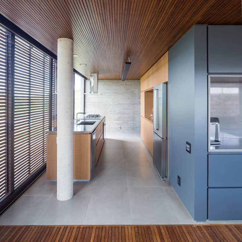Los listones de madera permiten la permeabilidad a los espacios que rodean el área social. Las áreas de reunión se componen simplemente de los espacios abiertos que enmarcan el paisaje exterior como retratos.