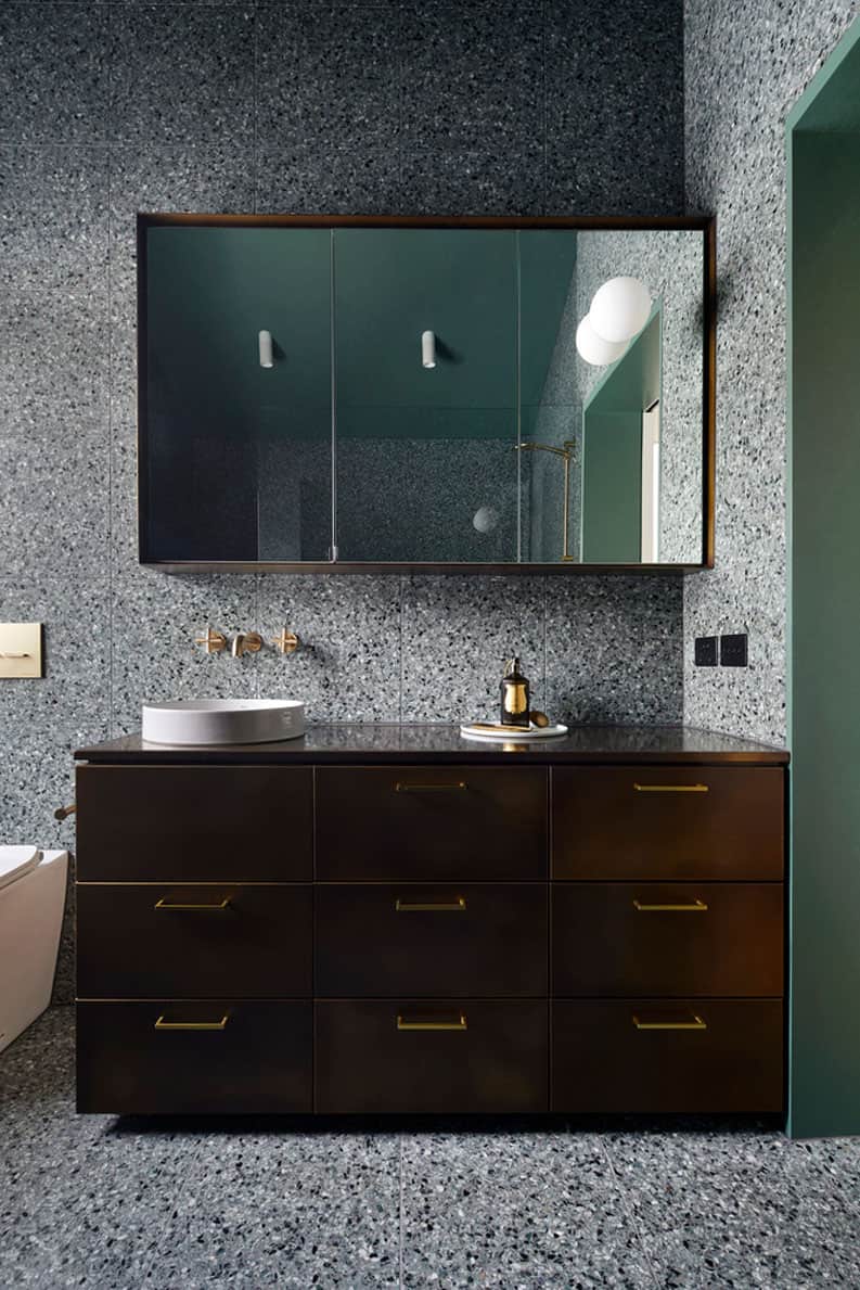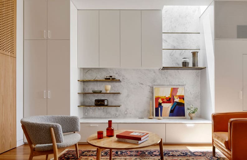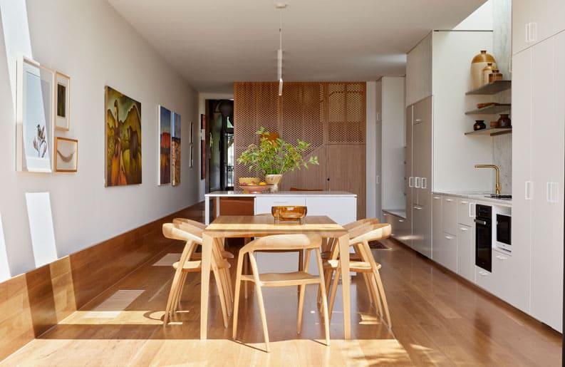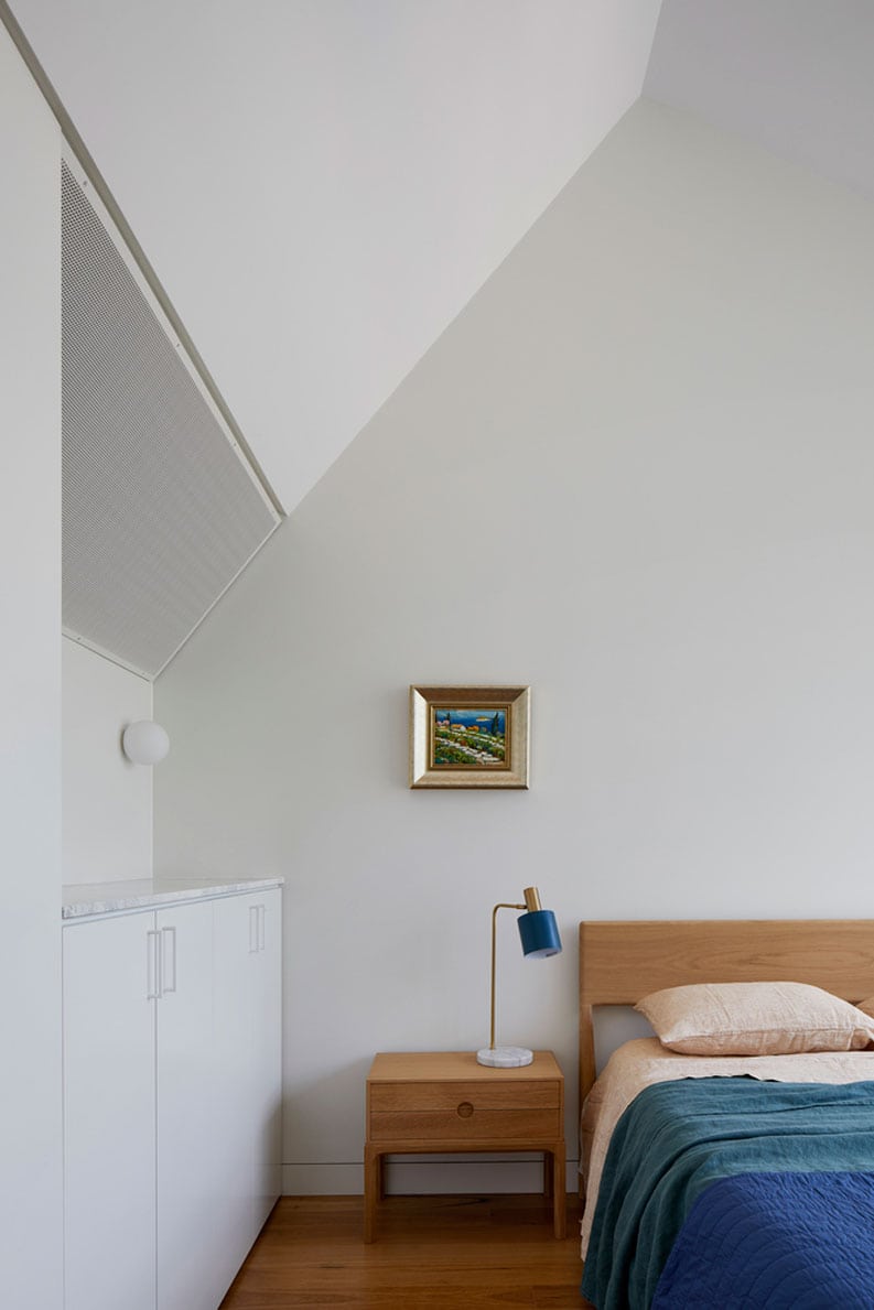 Es un ejercicio de creación de formas que conecta lo antiguo con lo nuevo. Además de establecer un dramatismo espacial en lo que de otro modo habrían sido habitaciones utilitarias en el piso superior. Una paleta sencilla de maderas duras australianas y superficies blancas se complementa con salpicaduras táctiles de latón y ricos momentos de color que se revelan tras las puertas cerradas.