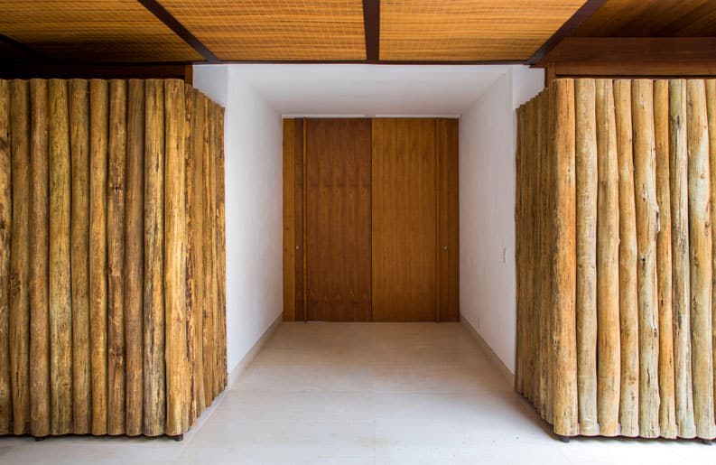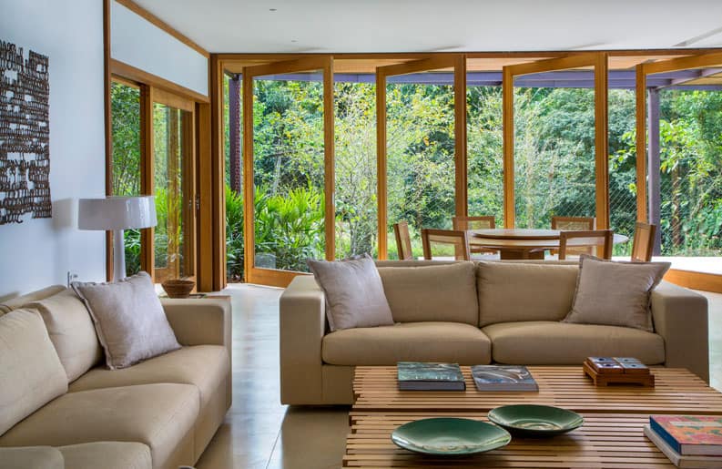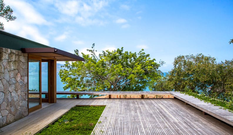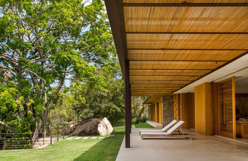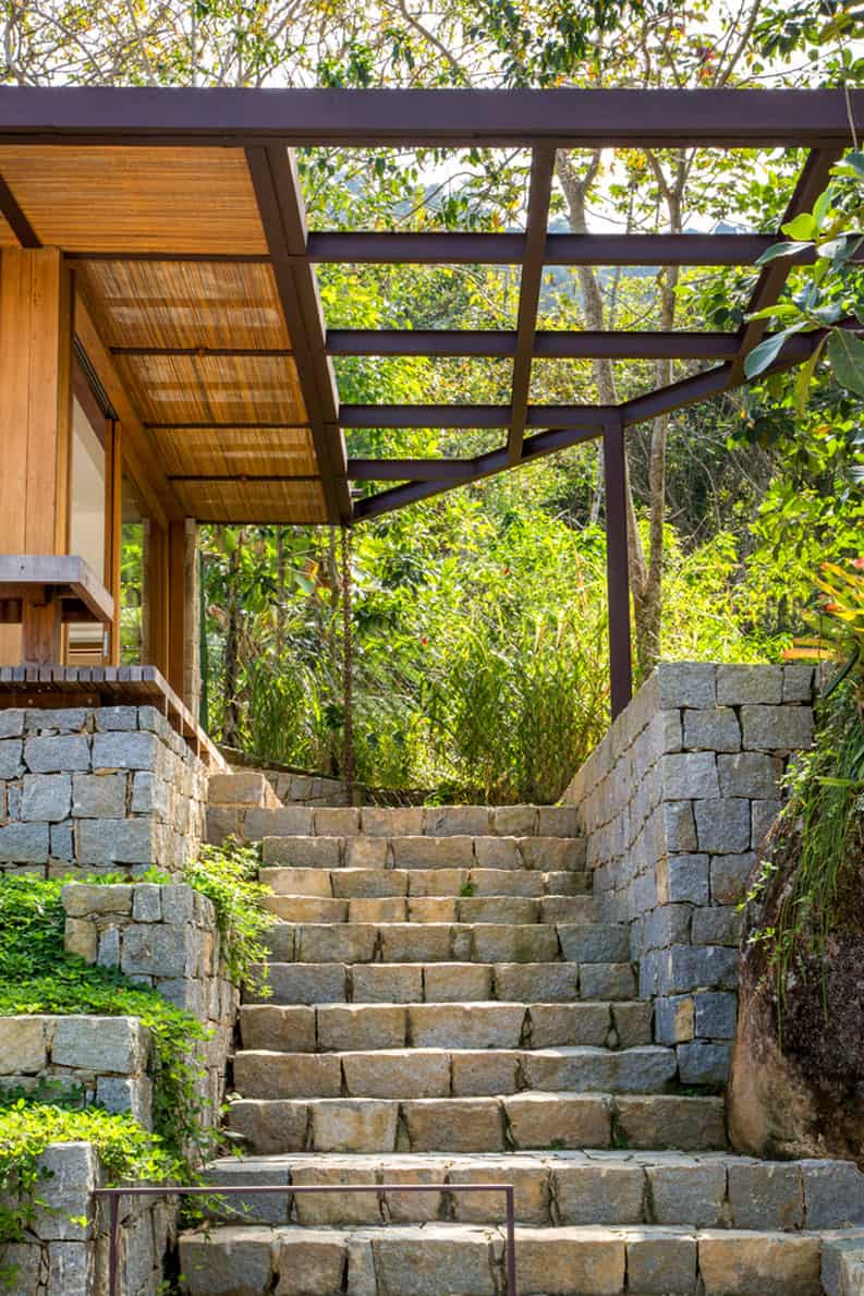 La realización de Casa Indah estuvo determinada por el paisaje privilegiado de la propiedad, situado en la Costa Esmeralda de Brasil. El acceso está marcado por una circulación vertical en piedras naturales, en torno a una higuera histórica.