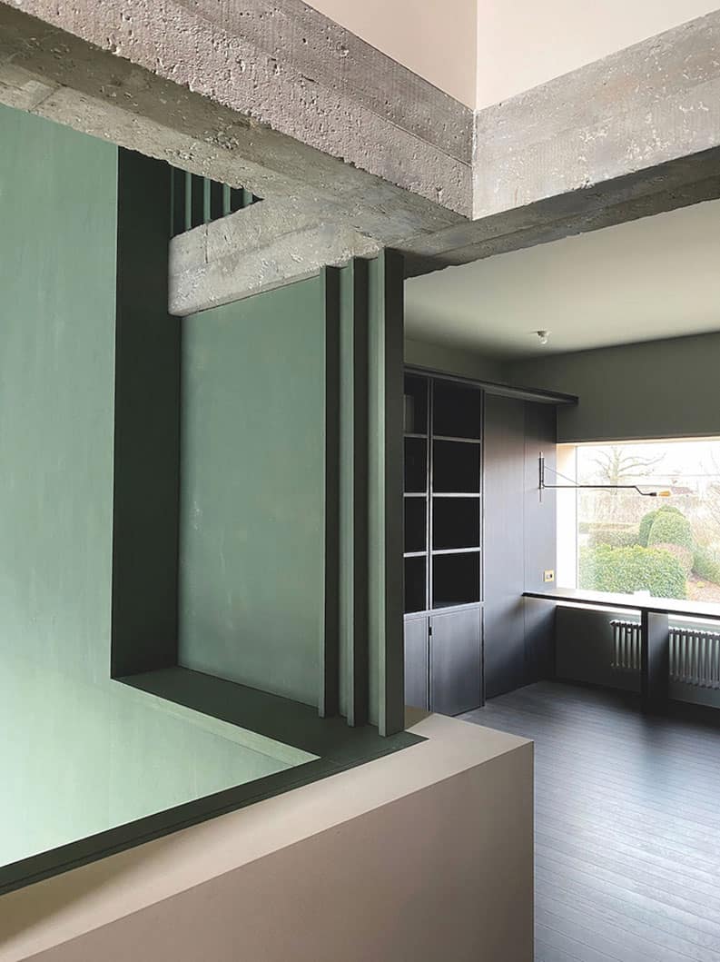 El comedor es un espacio solemne de doble altura, pintado de verde y orientado al sur. En contraposición, la cocina es un espacio comprimido, revestido de roble oscuro.