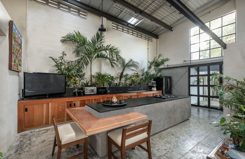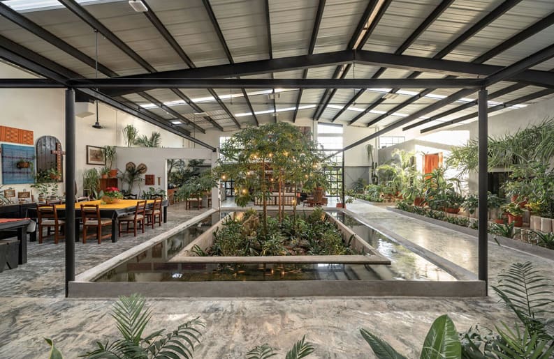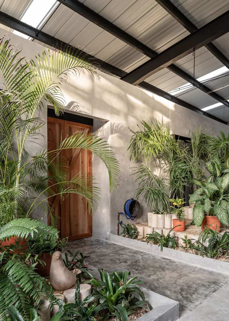 El uso de materiales en su aspecto natural enfatiza el carácter industrial del proyecto. Y mediante la selección de vegetación y macetas de barro se logra transmitir calidez espacial.