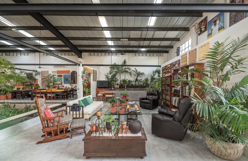 Se reutilizaron y transformaron elementos producto del desmantelamiento de la bodega original a manera de puertas, lámparas y elementos decorativos. Así como el uso de cilindros de concreto considerados material de desecho en pruebas de resistencia de laboratorios de materiales.