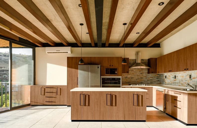 Generando un ambiente agradable al utilizar materiales aparentes como los muros de concreto, piedra, detalles en madera y carrizo proveniente de los pueblos aledaños a la zona. Además de los ventanales que te permiten apreciar la luz natural y el aire fresco, sintiéndote acogido y feliz en un espacio que puedes llamar casa.