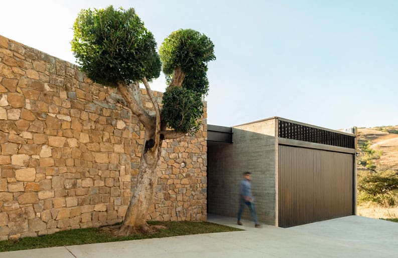 Casa Laurel se diseña con una fachada discreta que provoca un interesante contraste con la contrafachada. Caracterizada por su volumen establecida por la topografía del terreno y las necesidades del proyecto.