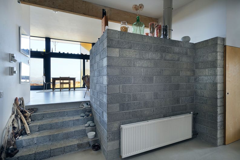 La pared del bloque rodea la chimenea, la principal fuente de calor, que se coloca tradicionalmente en el centro de la casa con la línea metálica elevándose a través del espacio. La escalera de hormigón sin terminar, cuyo enlucido final resultó siendo demasiado desafiante para los clientes, se convirtió en un resultado duradero del proceso de autoconstrucción hecho a mano.
