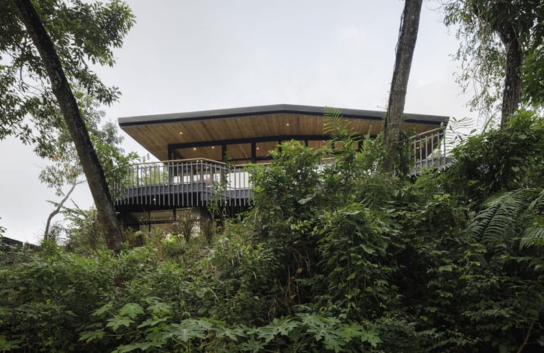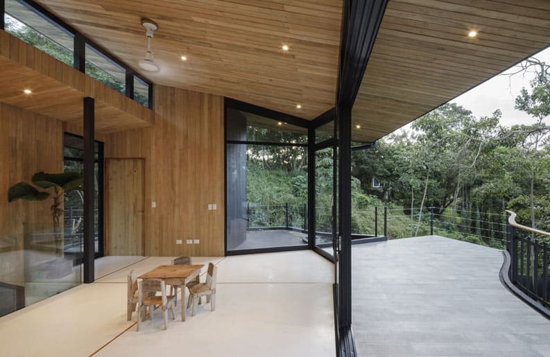 Su área social del segundo piso se abre completamente a las vistas con puertas corredizas de vidrio y el acabado de madera del gran techo crea una continuidad desde el interior hacia el exterior.