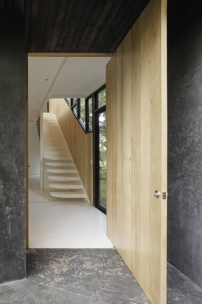 Las paredes exteriores de hormigón negro crean un fondo para la vegetación verde que lo rodea. Al mismo tiempo, da contraste y privacidad con las áreas interiores blancas de los dormitorios.