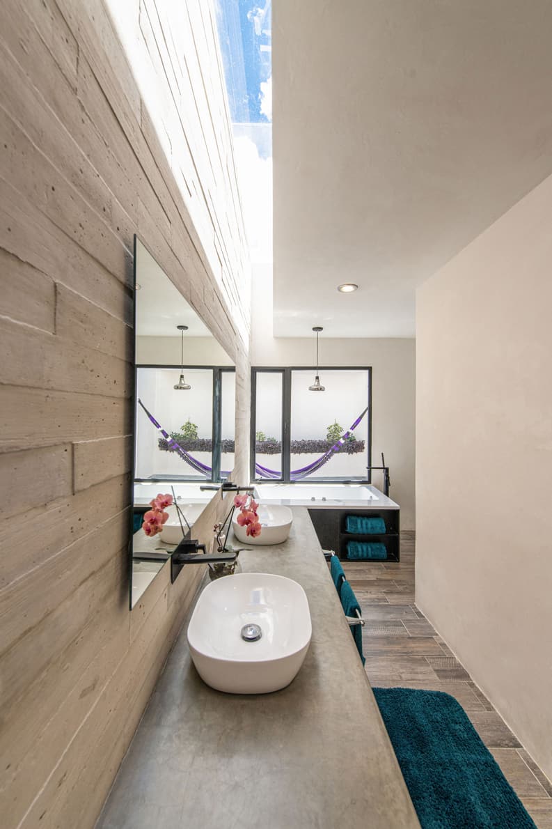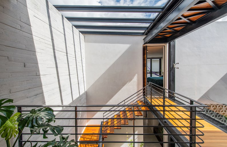 Pensando en la comodidad y el habitar cotidiano se crearon sistemas de ventilación e iluminación indirecta a través de domos. Y el diseño y fabricación de una celosía de concreto.