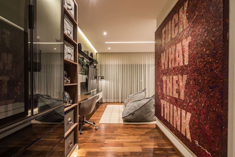 Las otras dos habitaciones de la planta alta se diseñaron con materiales generales neutros con el fin de que detalles como el arte y los tapetes fueran pinceladas de color en cada rincón. El uso estratégico de textiles, además de brindar un mayor confort en el espacio, resulta ser el elemento clave para el mejoramiento acústico. Pues al ser un espacio juvenil se buscó crear un mayor nivel de aislamiento del sonido con las áreas colindantes.