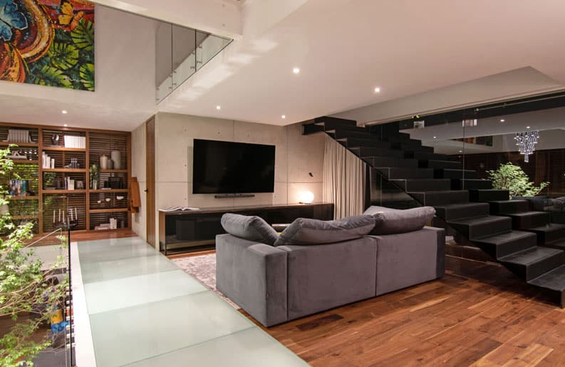 Dos sótanos, planta baja, mezzanine y planta alta, conforman los cinco niveles de esta casa. El ingreso principal se encuentra en la planta baja y da una cálida bienvenida a sus habitantes e invitados con una triple altura, en la que resalta la belleza natural de un árbol de arrayán y una colorida escultura del artista “Dorit Levinstein”.