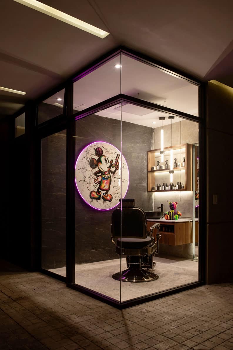 En el primer sótano se instalaron las áreas de recreación y diversión de Casa PH. El cuarto de juegos está integrado por la cava, el bar, una mesa de poker y un cómodo sillón para ver la televisión. Y se vincula con el área de la terraza, alberca, con un puente de cascada que crea una conexión entre la tierra y el agua. Y la barbería donde, a pesar de ser un espacio pequeño, el arte y el diseño no se que-daron atrás.