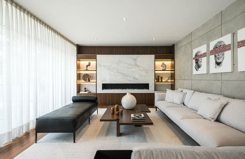 La magnificencia de sus elementos como el mármol Calacatta y la madera de nogal americano en conjunto con obras exclusivas de arte que brindan personalidad a cada espacio y su relajante ambiente natural. Gracias a una importante cantidad de árboles en los jardi-nes que hacen sentir al usuario conectado con la naturaleza, aislado de los ruidos de la ciudad. Convierten a este proyecto en una exquisita obra de arte que brinda armonía con la naturaleza.