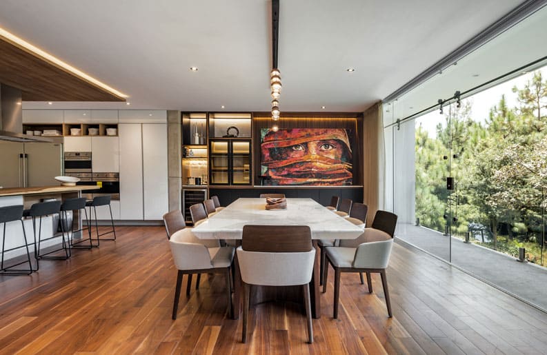 En el recibidor se integró una recamara para visitas que puede convertirse en un estudio de arte. Además, se vinculó el área de cocina, la estancia y el comedor con el fin de crear un solo espacio armónico y transitable que incentive la convivencia familiar en todos los espa-cios de la propiedad.