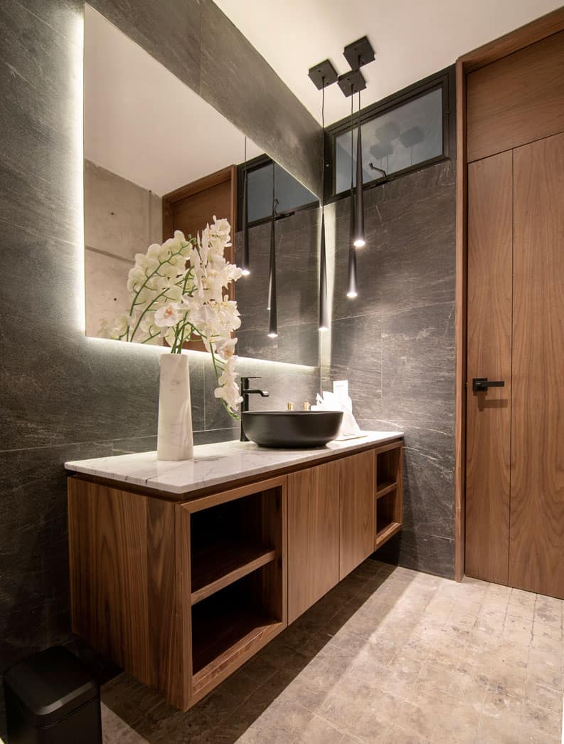 El walk-in closet es el vínculo que dirige hacia el baño de esta habitación, el cuál fue recubierto de mármol gris Rochelle en muros y pisos. Haciendo un contraste con el revestimiento de mármol blanco del mueble de baño, diseñado exclusivamente para este proyecto.