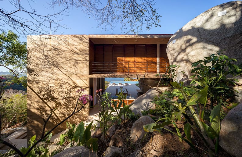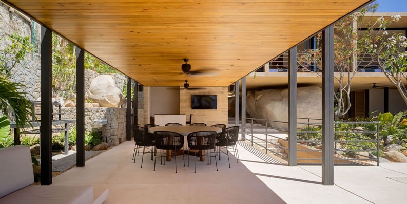 Una propiedad que no tiene frente o detrás, sino que se abre a varios paisajes con igual jerarquía. Encontrando en los distintos niveles la oportunidad de albergar las áreas de servicios, cisternas, bodegas y un pequeño departamento independiente. Creando terrazas y espacios de descanso con distintas oportunidades de vista y asoleamiento en estrecho diálogo con lo natural, las rocas, los árboles y el paisaje.