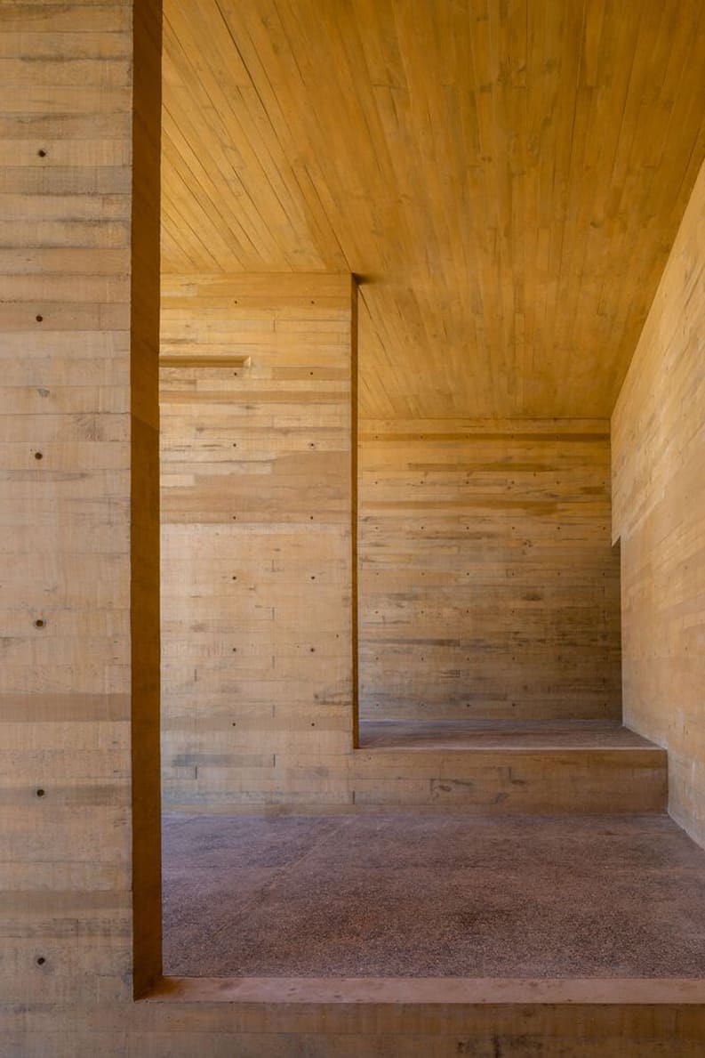 El uso de un solo material, concreto con color, producto de la mezcla de cemento y arena local con distintas estrategias en sus acabados finales para volverse casi madera en muros de acabado aparente enduelado y pisos lavados y antiderrapantes. De bajo reflejo lumínico, pero también de baja absorción térmica para poder caminar sin zapatos.