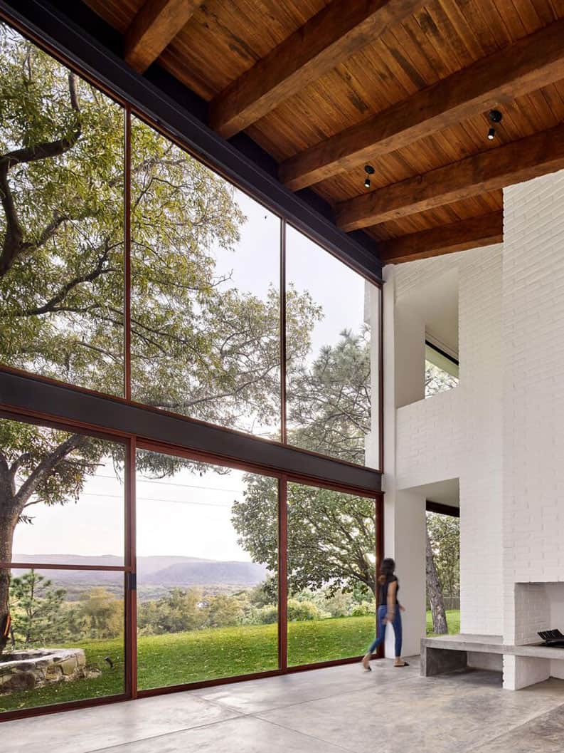 Cuenta con techos inclinados con recubrimiento y vigas de madera y en la exterior teja de barro rojo, una sala a doble altura con un ventanal de piso a techo que permite iluminación y ventilación natural.