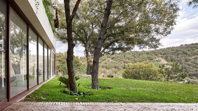La geometría y materialidad favorece al mejor aprovechamiento del terreno. De esta manera, desde que se ingresa a Casa pinar, te recibe un ventanal que abre la vista al bosque.