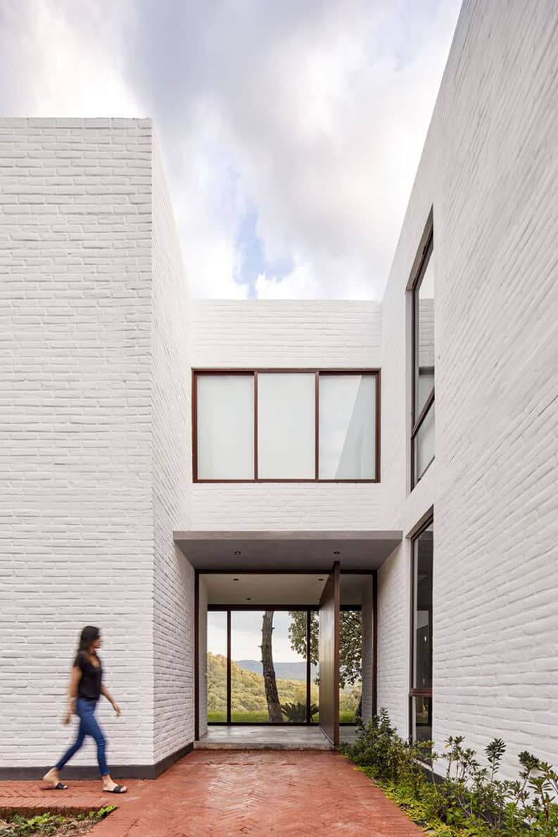 Una geometría buscando adaptarse a su entorno, una fachada principal con pocas ventanas. Para que al entrar a Casa pinar se pudiera apreciar un ventanal de lado a lado que permite la vista clara hacia el bosque de la primavera.