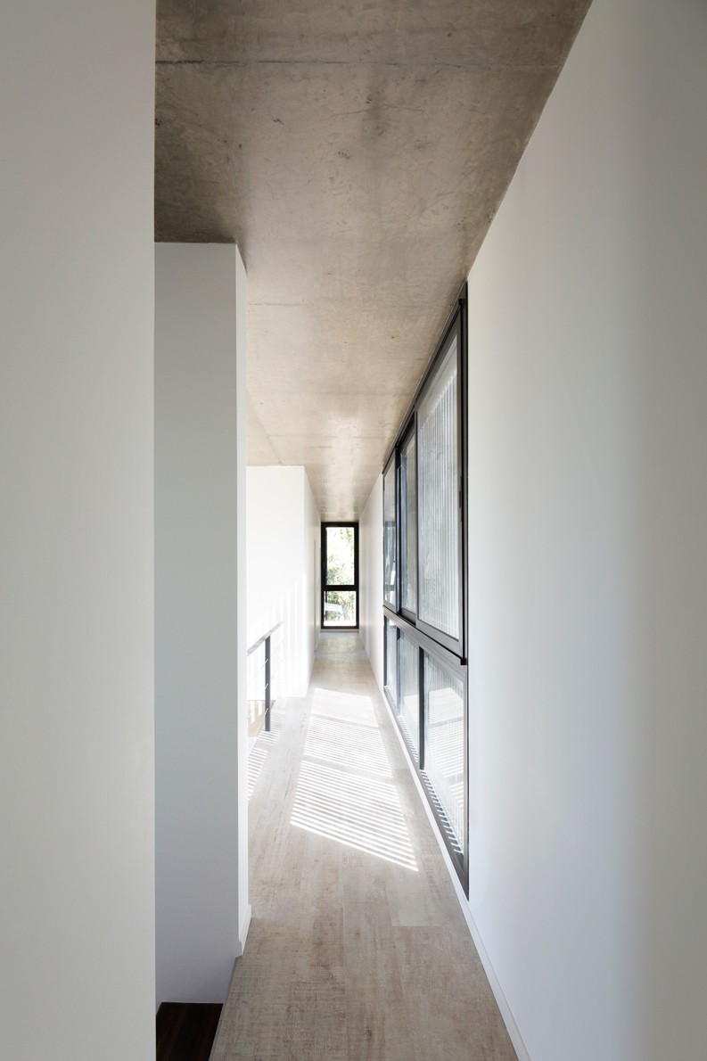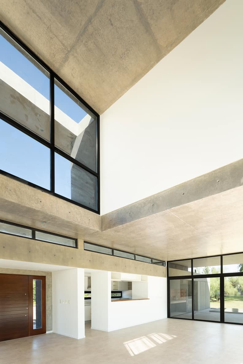 El estar desarrollado en doble altura permite tomar la luz del norte a través de un aventanamiento abierto a dicha orientación que asoma por sobre el volumen de planta baja y se acopla a la planta alta articulando las dos barras desplazadas. Permitiendo dentro del mismo esquema desarrollar la escalera en un tramo perpendicular a la sección longitudinal de la vivienda.