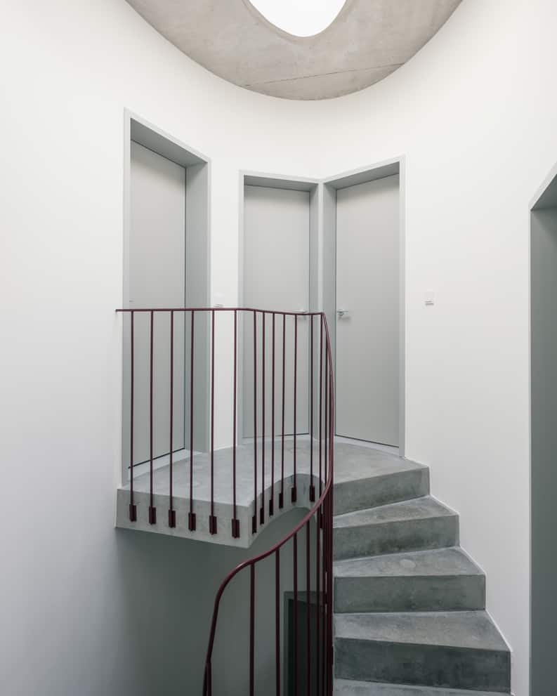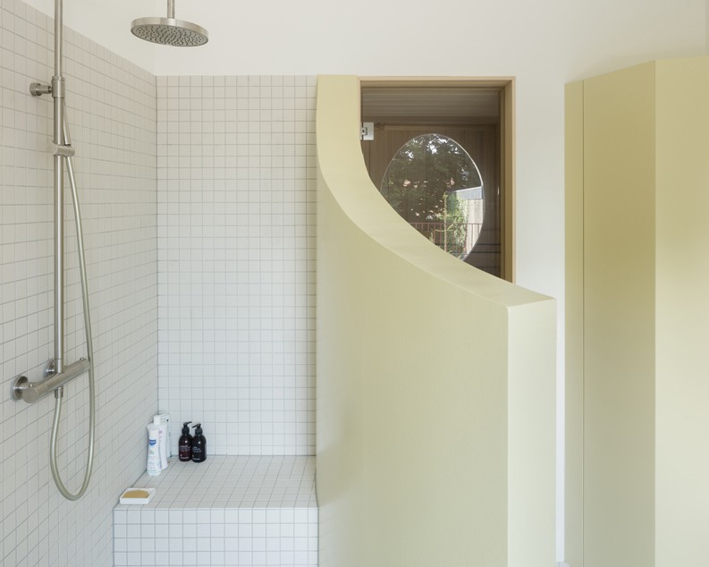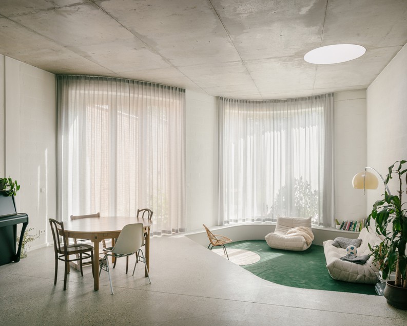 La planta se organiza en torno a la escalera central ovalada. El espacio vital se distribuye en 2 niveles para los distintos momentos del día: deberes, lectura, juego. Una cocina de doble altura en el lado de la calle da una gran dimensión a la casa y proporciona una conexión entre los diferentes espacios sociales.