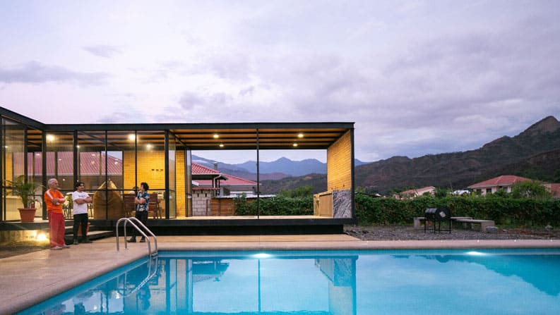 Tres habitaciones con baño privado cubren el programa de la zona de descanso. Mientras que, en la zona social, se programa la cocina, comedor y sala, más una extensión de patio cubierto que se fusiona con la barbacoa. En la zona húmeda se incluye jacuzzi, baño turco, baño alberca, lavandería, equipos y bodega. Siendo el eje de distribución espacial la alberca.