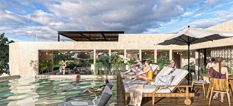 En el roof top se encuentra la amplitud y apertura que se necesita para poder disfrutar de un momento de relajación y diversión. Manteniendo espacios destinados a la convivencia con un área grillpara pasar las tardes y una alberca donde tomar el sol, se genera un espacio idóneo para disfrutar del ambiente que Tulum ofrece.