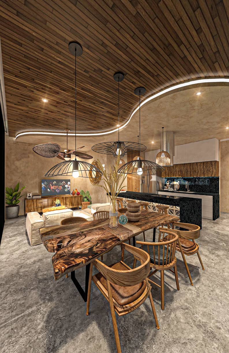 Entre los materiales destacan el uso de chukum y acabados en madera, dando a Departamentos Salvador calidez.