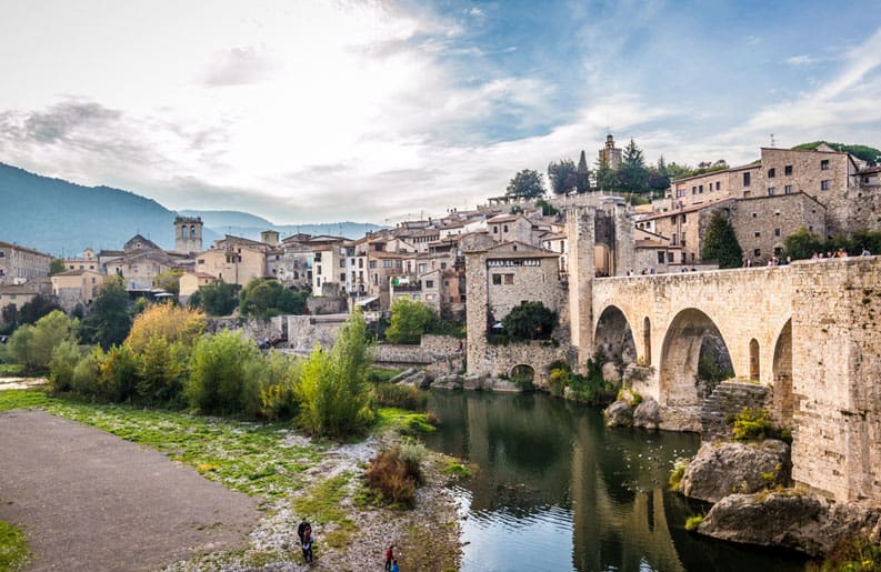 Situado en la provincia de Girona, este es uno de los pueblos medievales mejor conservados de Cataluña. Su puente románico, que se extiende sobre el río Fluvià, es una postal que parece sacada de un cuento.