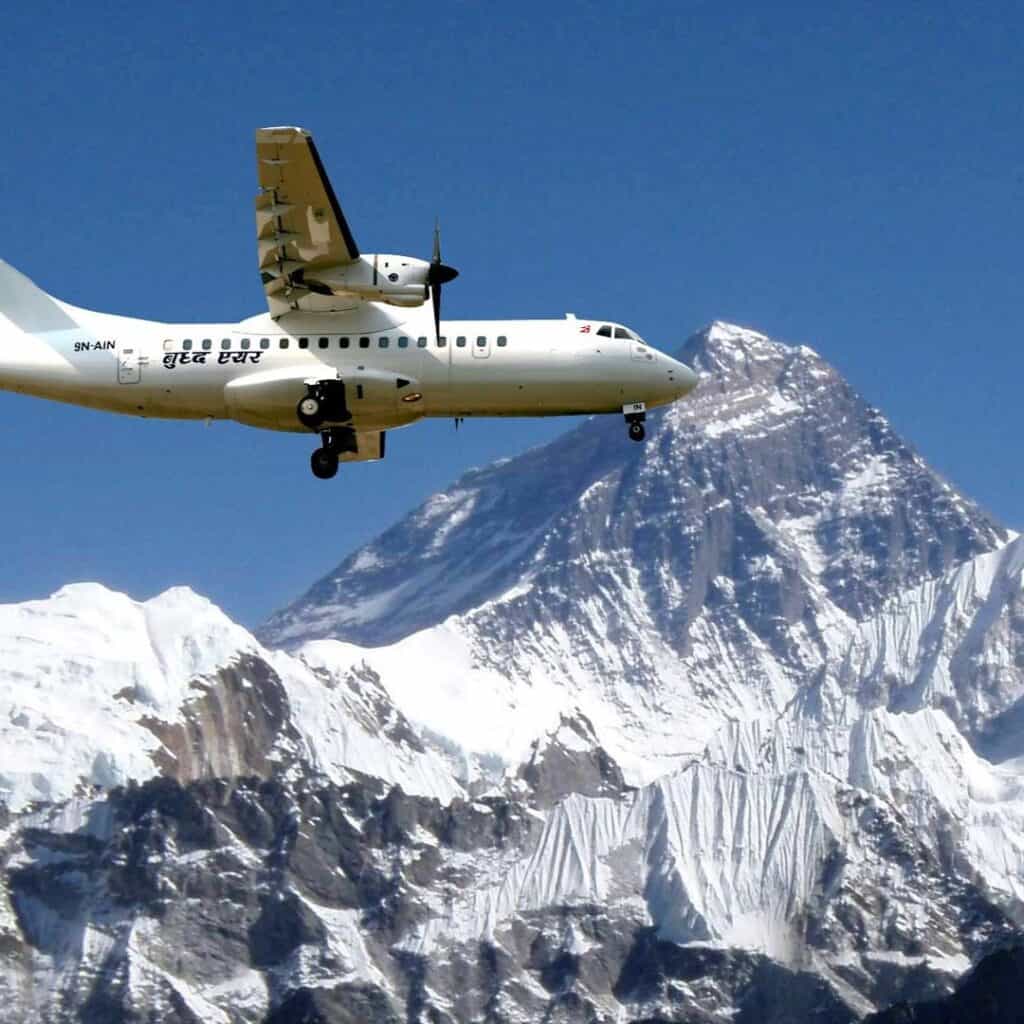 Desde el aeropuerto nacional de Nepal, puede tomar el vuelo programado todas las mañanas. El vuelo llega cerca de los 7000 metros. A esa altura se puede disfrutar de la vista del Everest desde el cómodo asiento junto a la ventana. El avión vuela sobre la región de Khumbu para ver de cerca el Everest y los otros picos destacados del Himalaya.