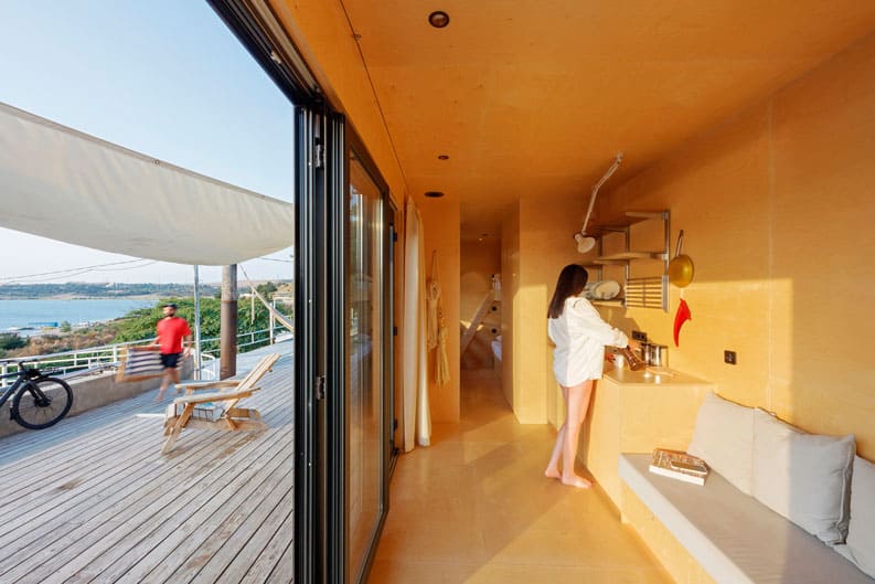 El interior se encuentra con el exterior durante el verano, creando una plataforma abierta y accesible con vistas al mar.