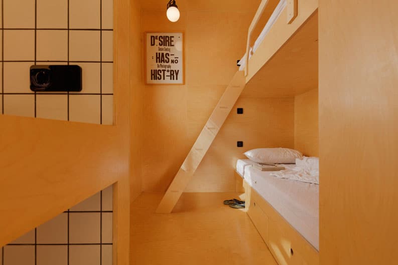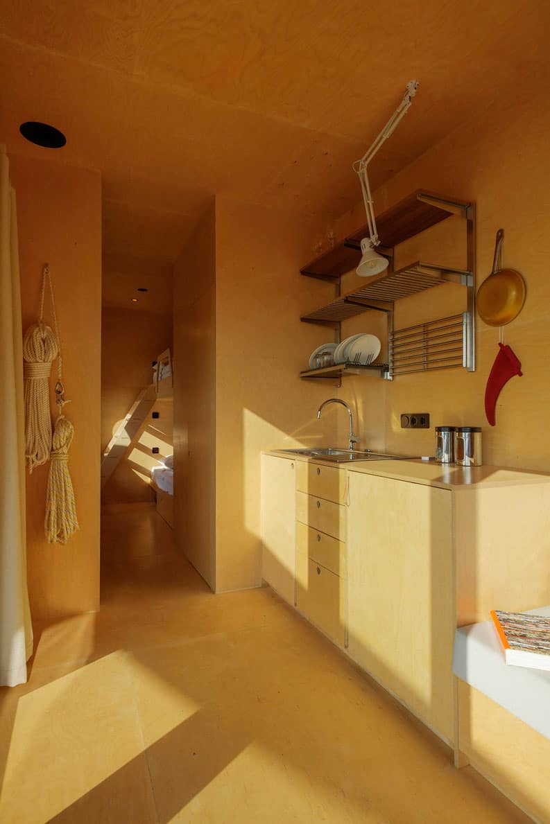 Se mantiene la disposición lineal del contenedor en el interior. Los bordes lejanos se transformaron en áreas de descanso y sus funciones auxiliares (baño y espacios de almacenamiento).