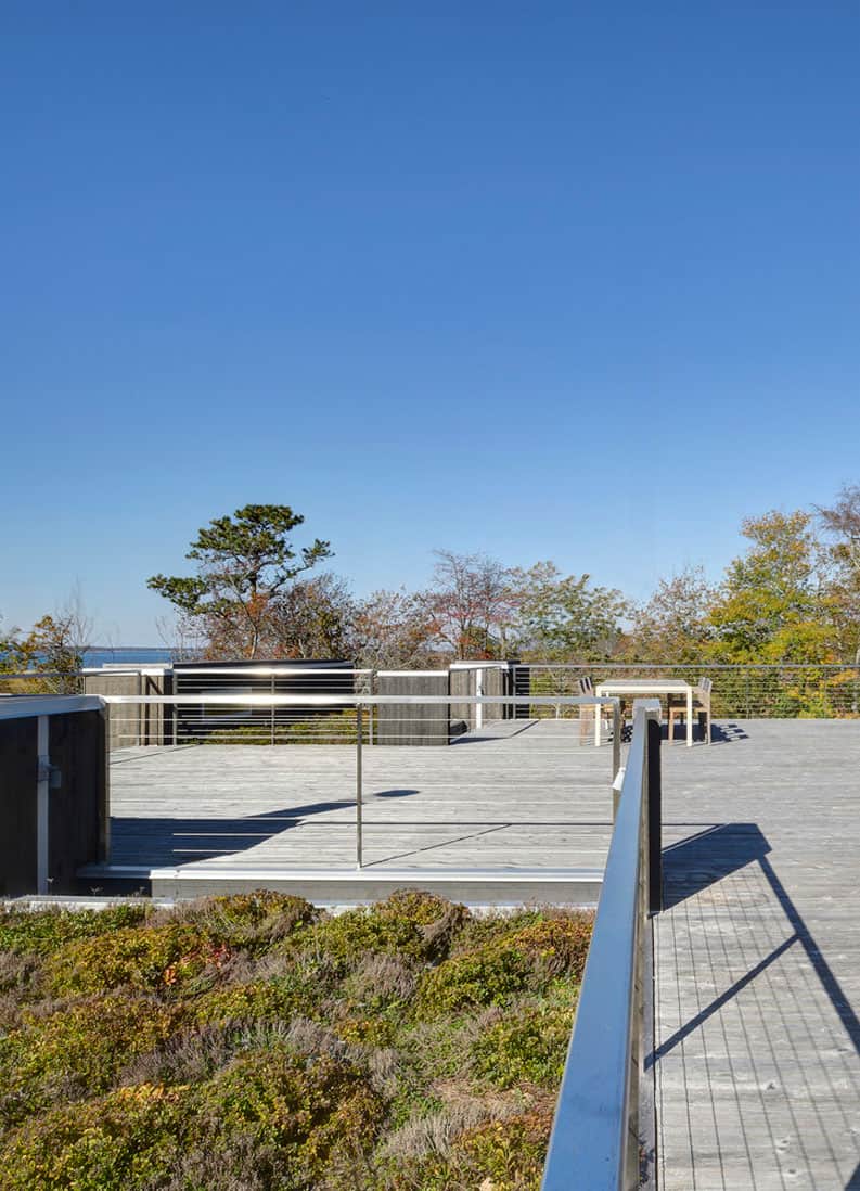 En la cubierta de los pilotes que se proyectan se dividen entre una baraja que coincide directamente con las zonas de estar abajo. Y un sistema de siembra modular instalado por encima de cada habitación para reducir la escorrentía.