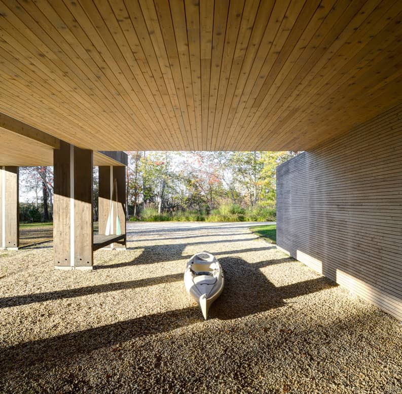El beneficio es triple. Cada abertura atrae luz a pesar de que los espacios interiores por debajo de la cochera conducen las aguas pluviales de la cubierta del techo hacia la tierra a través de bajantes integrales talladas en los pilotes. Y ventilada con un sifón de aire por el centro de la estructura.