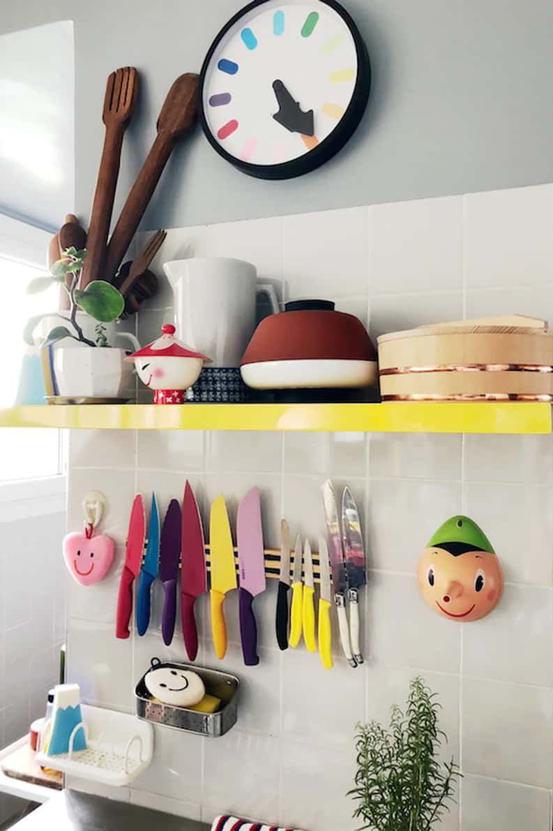 La habitación de la pequeña Leia es vibrante y lúdica. Decorada con cuadros de animales, un almohadón en forma de sandía y una lámpara colgante extravagante adornada con figuras de papel meticulosamente ensambladas.